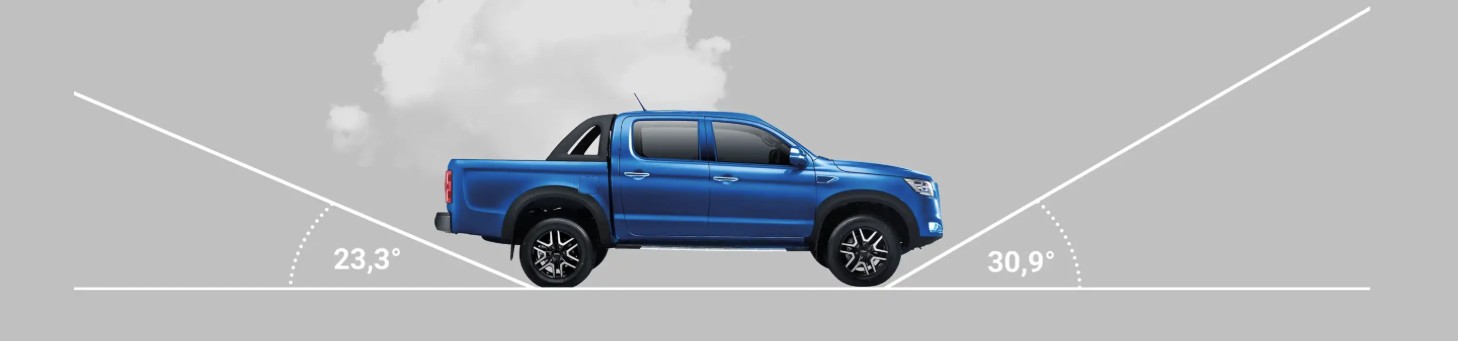 Kąt natarcia wynoszący 30,9° oraz kąt zejścia 23,3° należą do czołówki w tej klasie i są parametrami spotykanymi dotąd głównie w zaawansowanych autach terenowych. Wysoki prześwit, solidna konstrukcja ramowa oraz napęd 4×4 z reduktorem sprawiają, że pojazd pewnie radzi sobie zarówno w warunkach miejskich, jak i poza utwardzonymi drogami. To model, który łączy siłę, niezawodność i pełną kontrolę nad jazdą – niezależnie od terenu.
